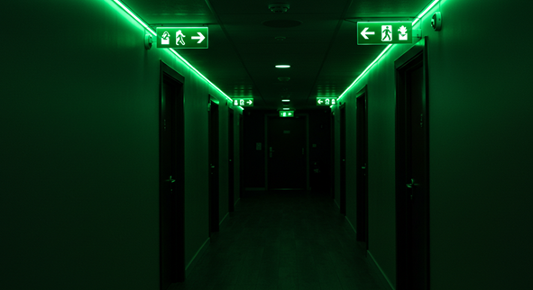 👉原則、宿泊室・避難経路に設置義務があり、床面照度はLED等で2lx、白熱灯で1lx以上を30分間維持する必要