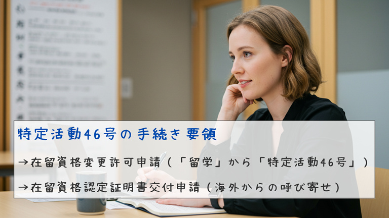 主に「留学」から「特定活動46号」への在留資格変更許可申請、または海外からの呼び寄せのための在留資格認定証明書交付申請の手続きがあります。